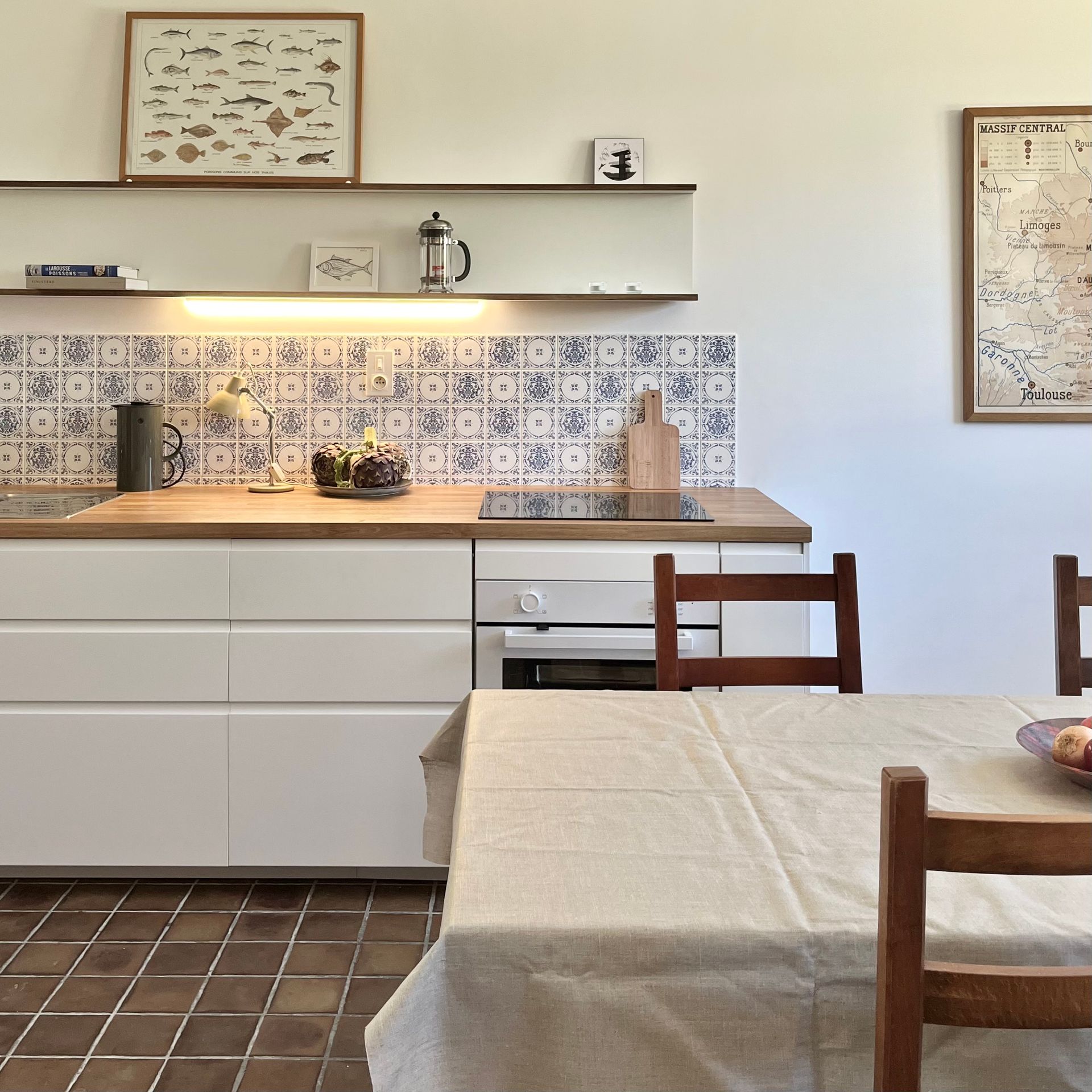 Wohnraum mit Steingutfußboden, Sitzbereich mit Sofa, Esstisch, gut ausgestattete, offene Küche, Spülmaschine, Ceranfeld mit Backofen, Kühlschrank mit Gefrierfach, Küchengeräte, Kaffeemaschine, Geschirr für 8 Personen, Toaster, Wasserkocher, Bügeleisen, Staubsauger, sep. WC, Badezimmer mit Badewanne, Warmwasserelektroboiler, elektrische Heizung, freies W-LAN, Rauchmelder, Küchenhandtücher und Reinigungsmittel.